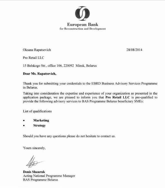 ГК "Pro Retail" аккредитована Европейским банком реконструкции и развития как Партнер по оказанию консультационных услуг для представителей малого и среднего бизнеса в рамках программы "Business Advisory Services".