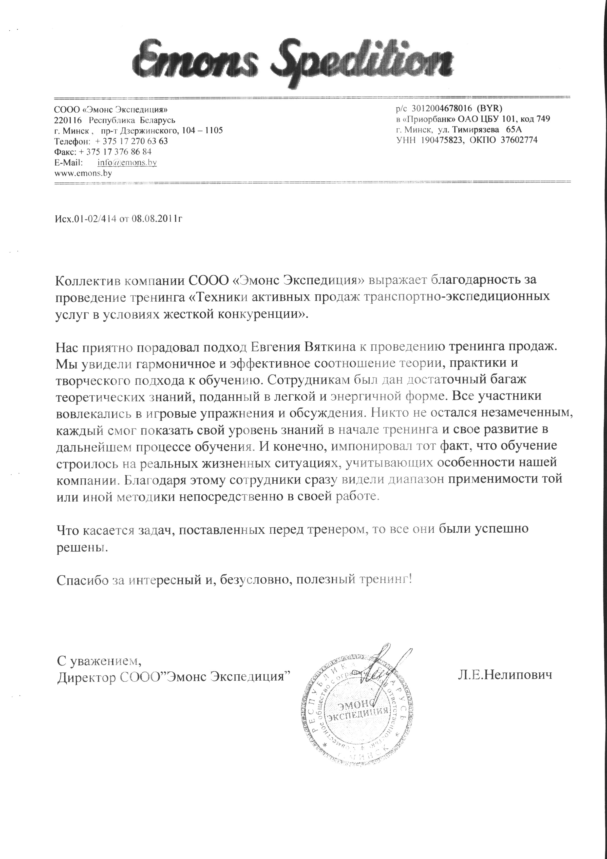 "... Нас приятно порадовал подход Евгения Вяткина к проведению тренинга продаж. мы увидели гармоничное и эффективное соотношение теории, практики и творческого подхода к обучению. Сотрудникам был дан достаточный багаж теоретических знаний, поданный в легкой и энергичной форме. Все участники вовлекались в игровые упражнения и обсуждения. Никто не остался незамеченным, каждый смог показать свой уровень знаний в начале тренинга и свое развитие в дальнейшем процессе обучения. И, конечно, импонировал тот факт, что обучение строилось на реальных жизненных ситуациях, учитывающих особенности нашей компании. Благодаря этому сотрудники сразу видели диапазон применимости той или иной методики непосредственно в своей работе.
